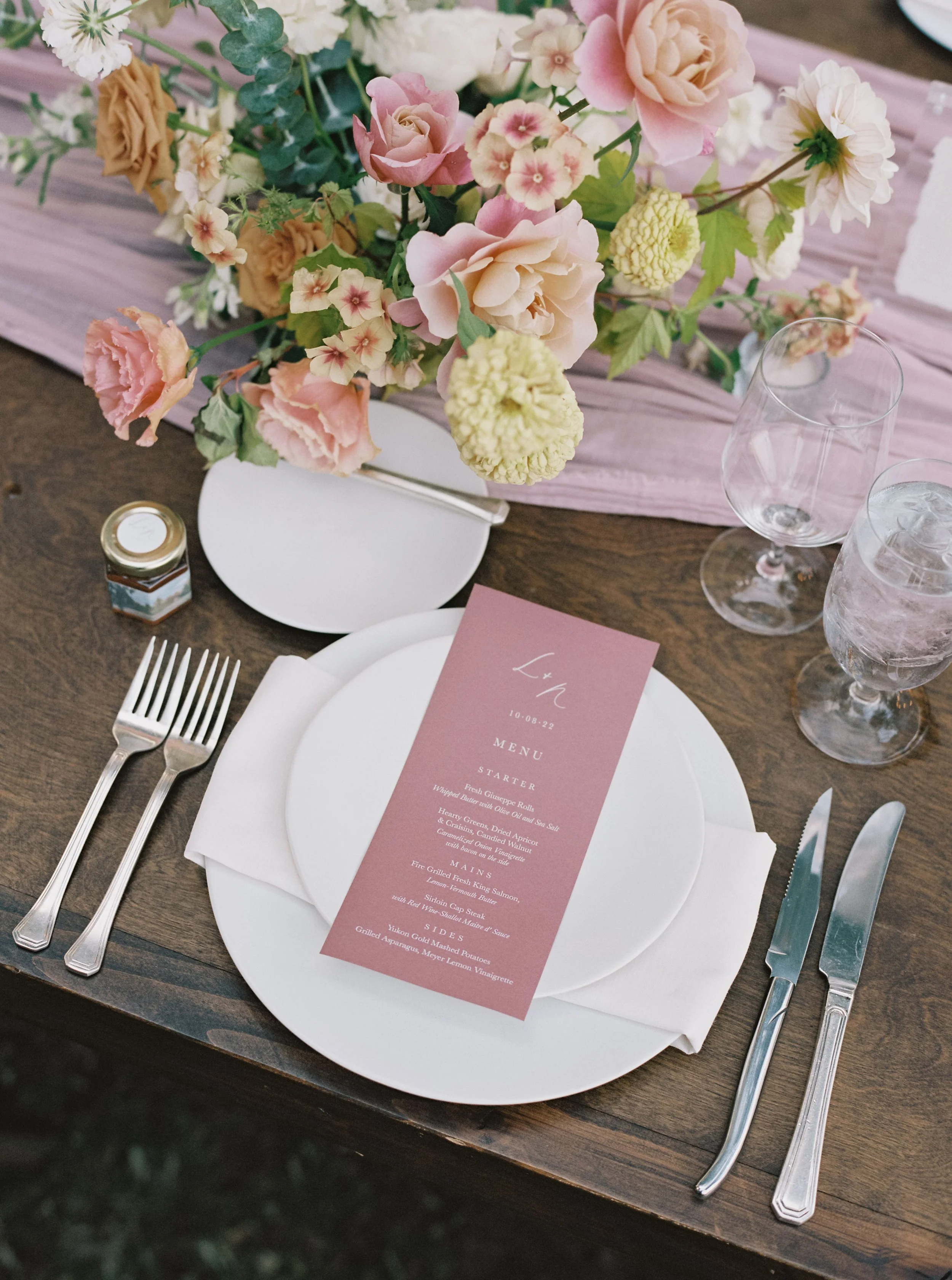 All of the details were thoughtful and sentimental. Nilan’s mother is an artist who painted the lakeside scene at the Downey’s residence, which was used as the envelope liner for their invitation suite, the backdrop for their welcome sign, and the labels for their honey favors. Which, not to mention, was honey harvested from Leah’s mothers bee hives. Leah’s sister drew the cutest photo of their dog Toby, which was used on their custom cocktail napkins.