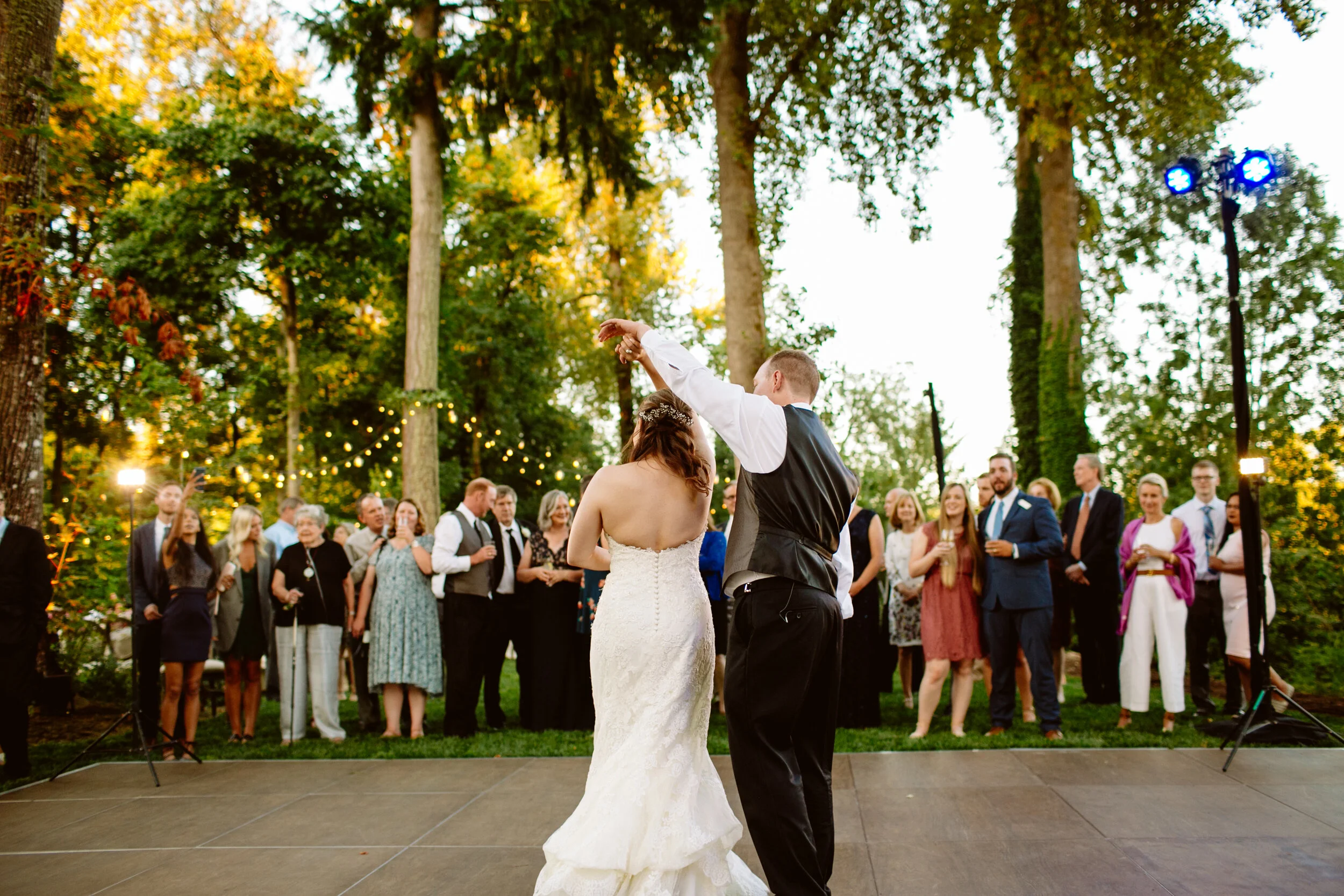With the help of Party Place and Greenlight Creative's lighting, we transformed the backyard of a 25-acre private residence backing up to the Willamette River, and turned it into the most romantic garden style wedding.