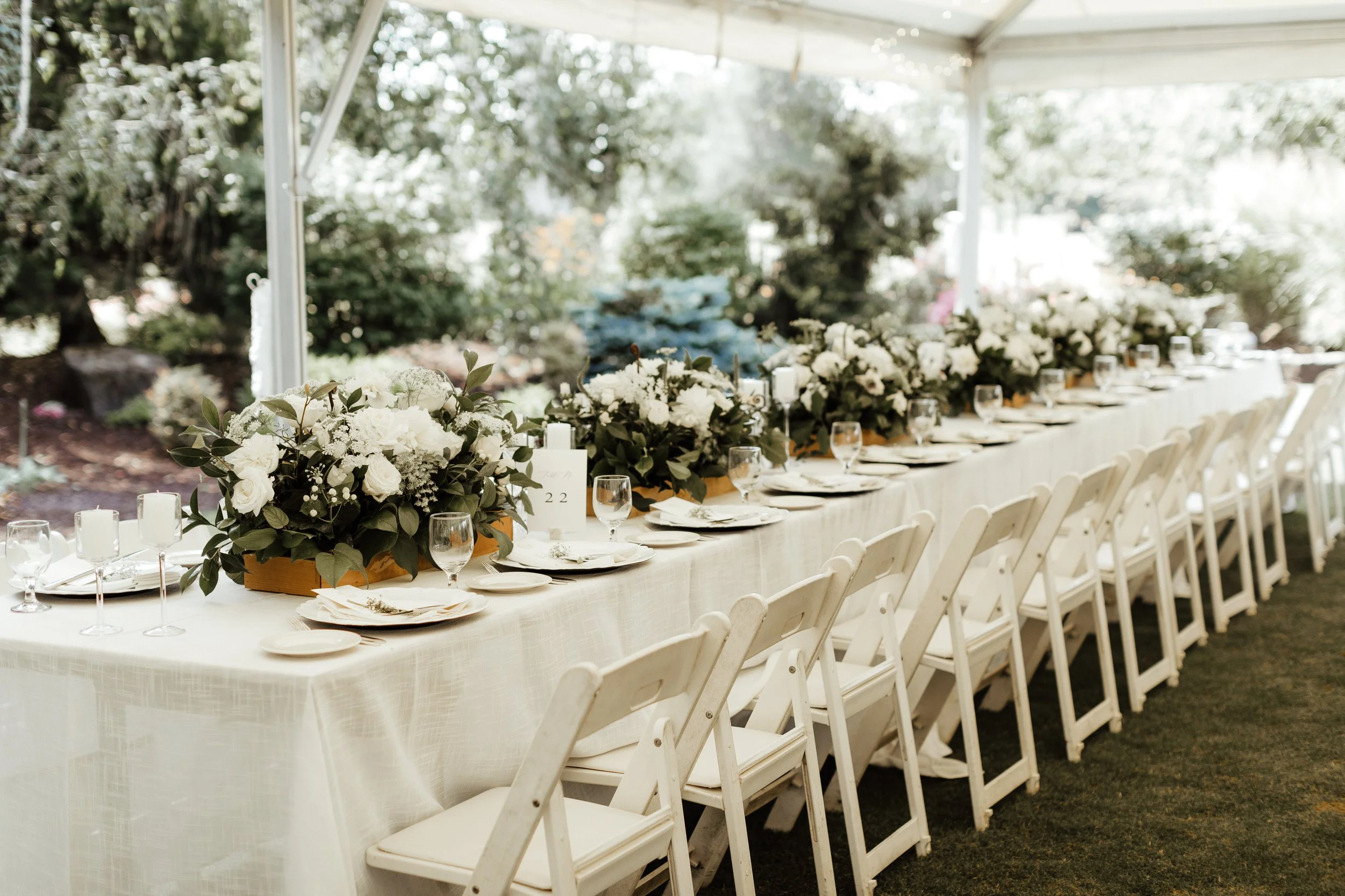 After guests enjoyed mingling on the covered patio during cocktail hour, they were seated under the lights of the tent for a delicious plated dinner, toasts from friends and family, and four different flavors of mouthwatering cake to choose from! I especially loved the beautiful thank you notes included at each guest’s place setting. Those personal touches always tug at my heartstrings!