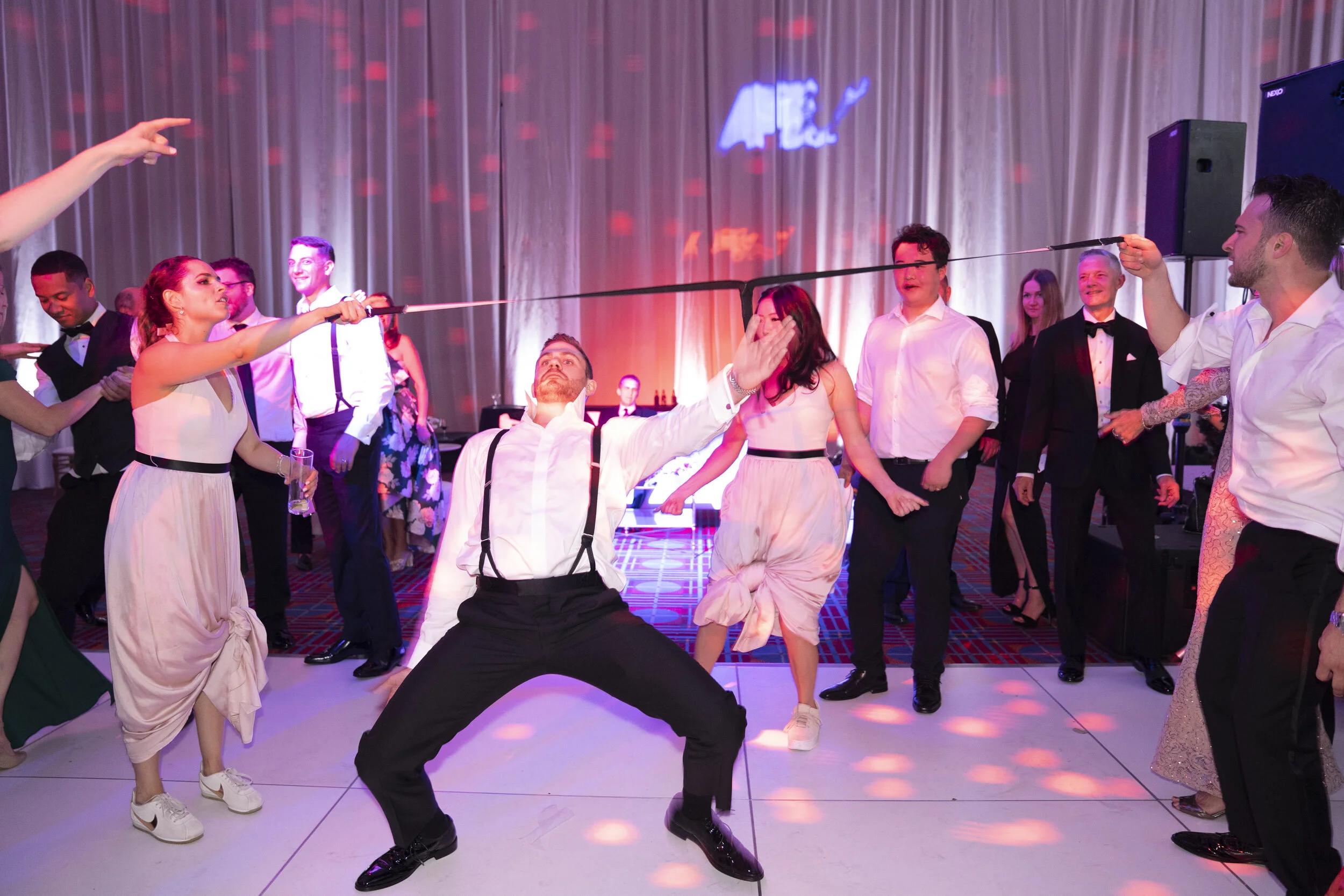 We utilized three separate vignettes of lounge seating throughout the space, two of which surrounded the white dance floor, to give guests an area to sit and enjoy the moment. As the couple was announced into the reception, they performed three songs for their guests. It was pure magic, and there wasn't a dry eye! Precious Byrd performed throughout the night and to give Brooklyn and Matthew an element of surprise, a Nike Air Force One disco "shoe" dropped from the ceiling to kick off the dance party. It was the perfect homage to Angela, the most fab mother-of-the bride who is a Nike executive.