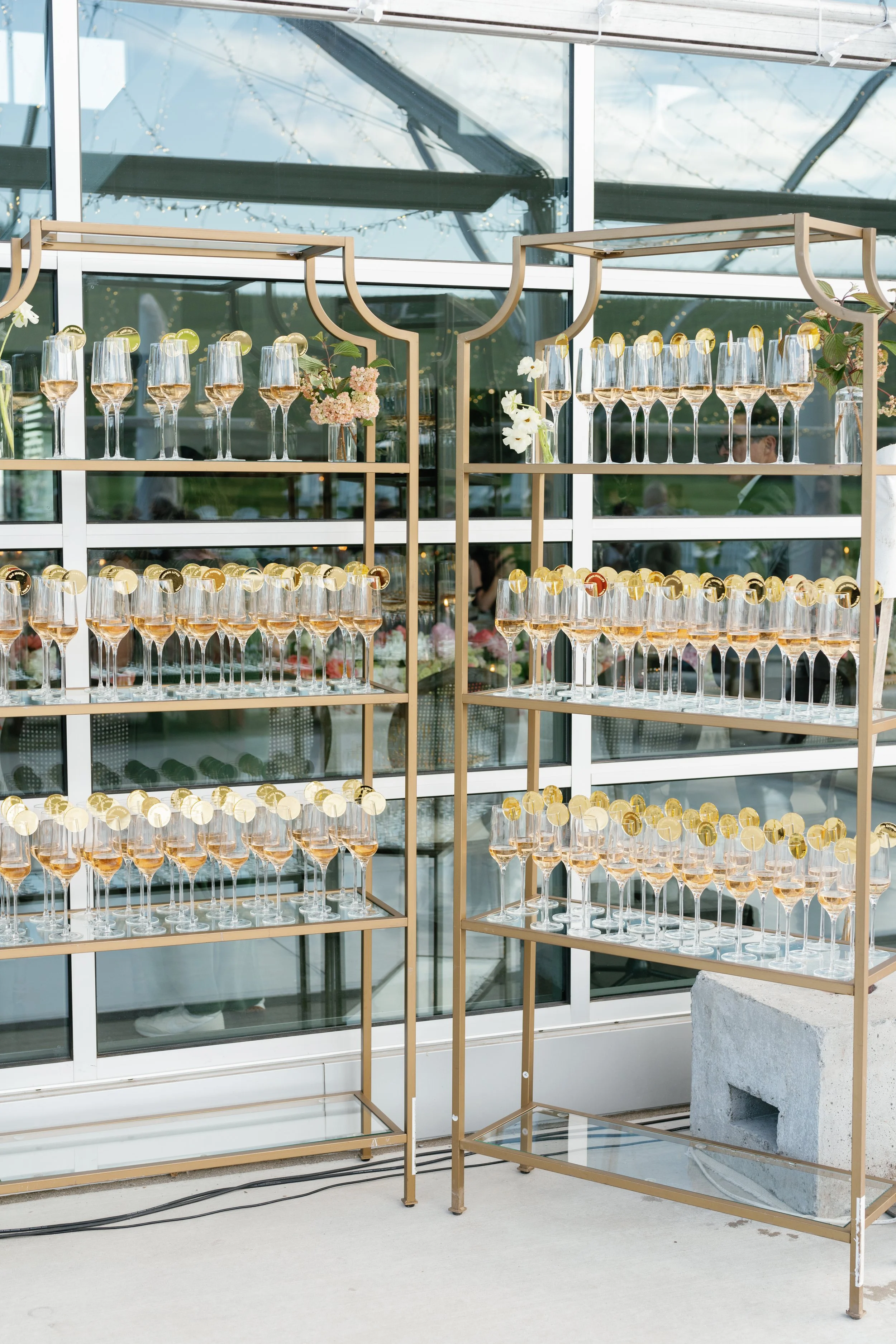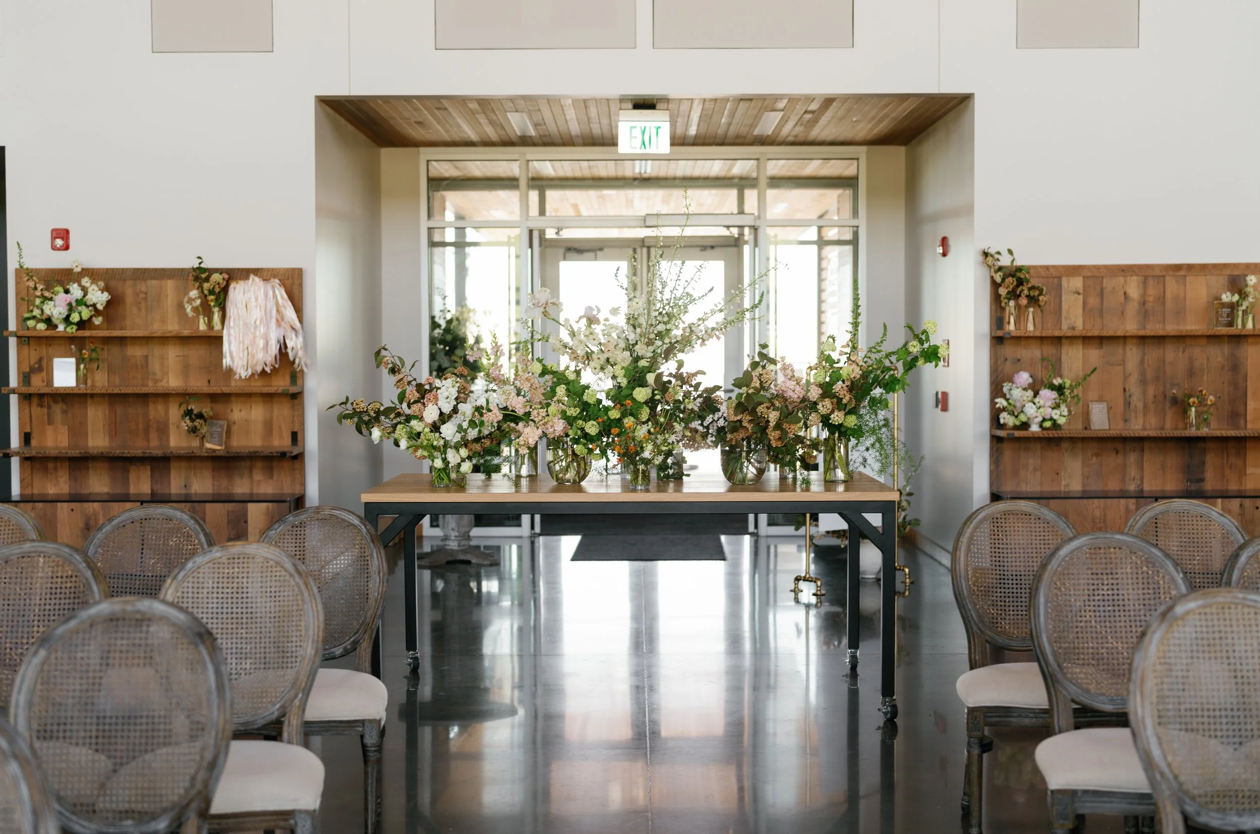 On the wedding day, the ceremony left no dry eye in the house, as Cristi and Mike made sure to honor their late spouses in their ceremony- a true testament to the love they share and bonded over. While guests enjoyed a variety of different canapés provided by the talented in-house catering team at Stoller, our team moved quickly to transform the inside of the Experience Center for dinner. La Tavola/BBJ linens, beautiful coral and white peonies and candlelight to bring in the softness and romanticize the space.